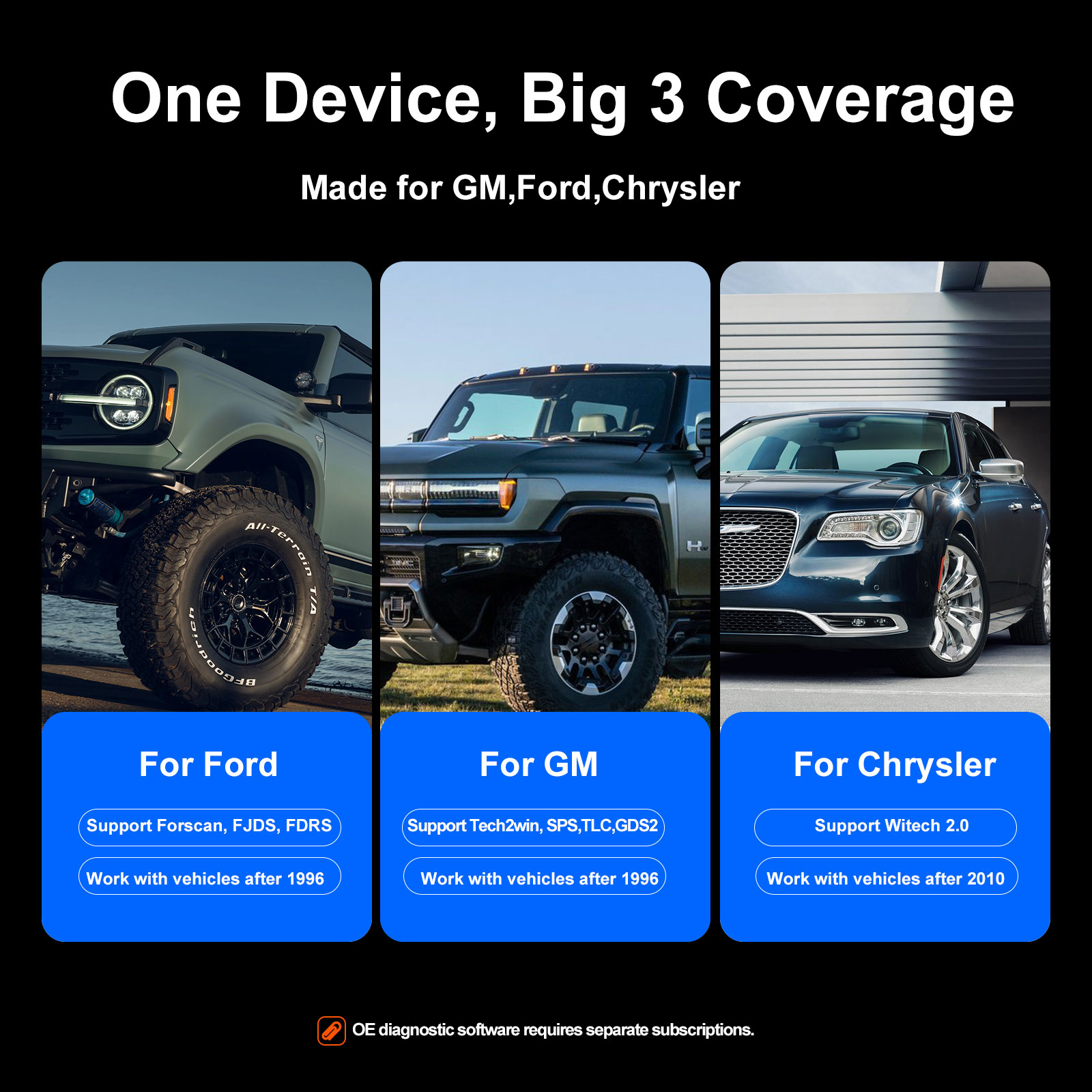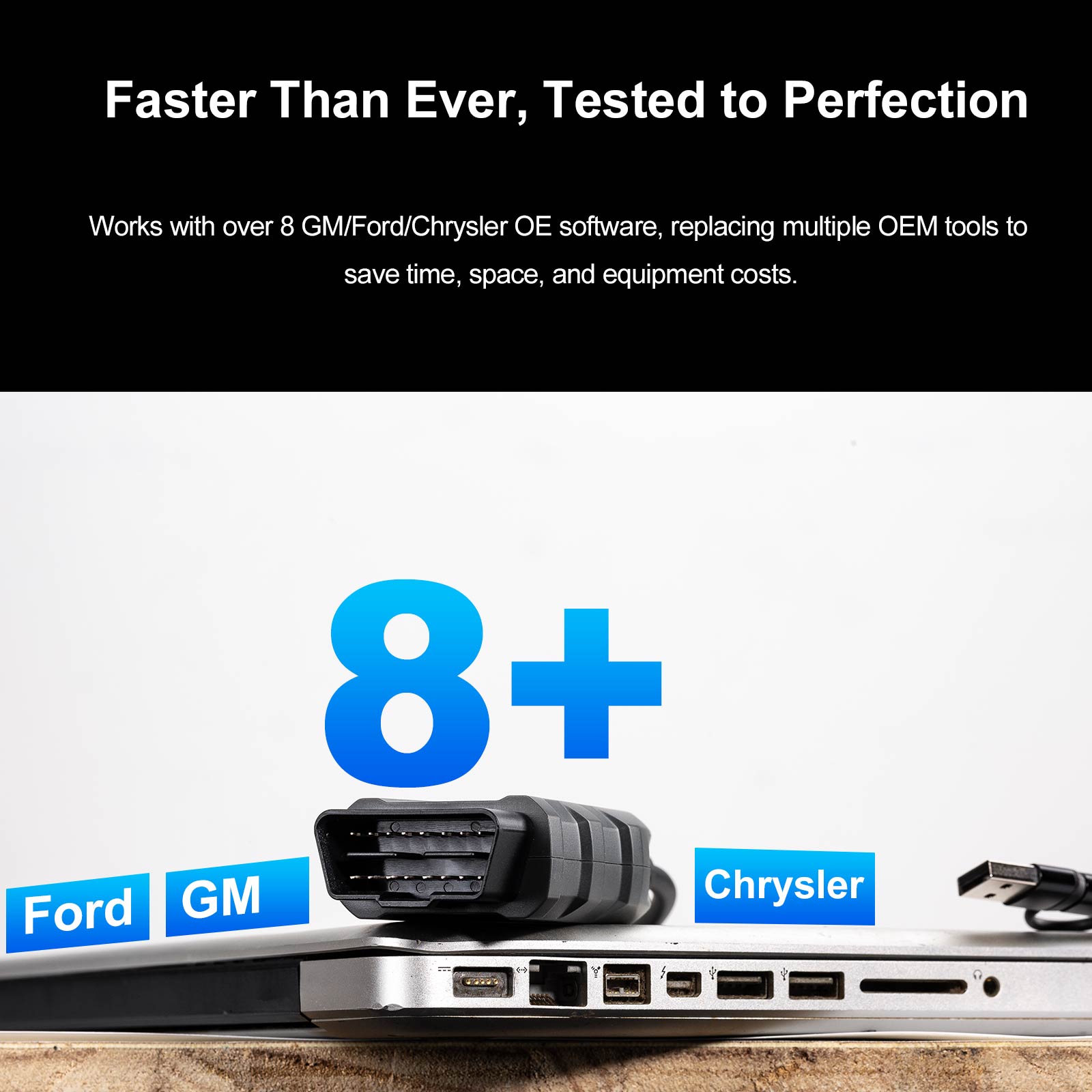 Works with over 8 GM/Ford/Chrysler OE software, replacing multiple OEM tools to save time, space, and equipment costs.